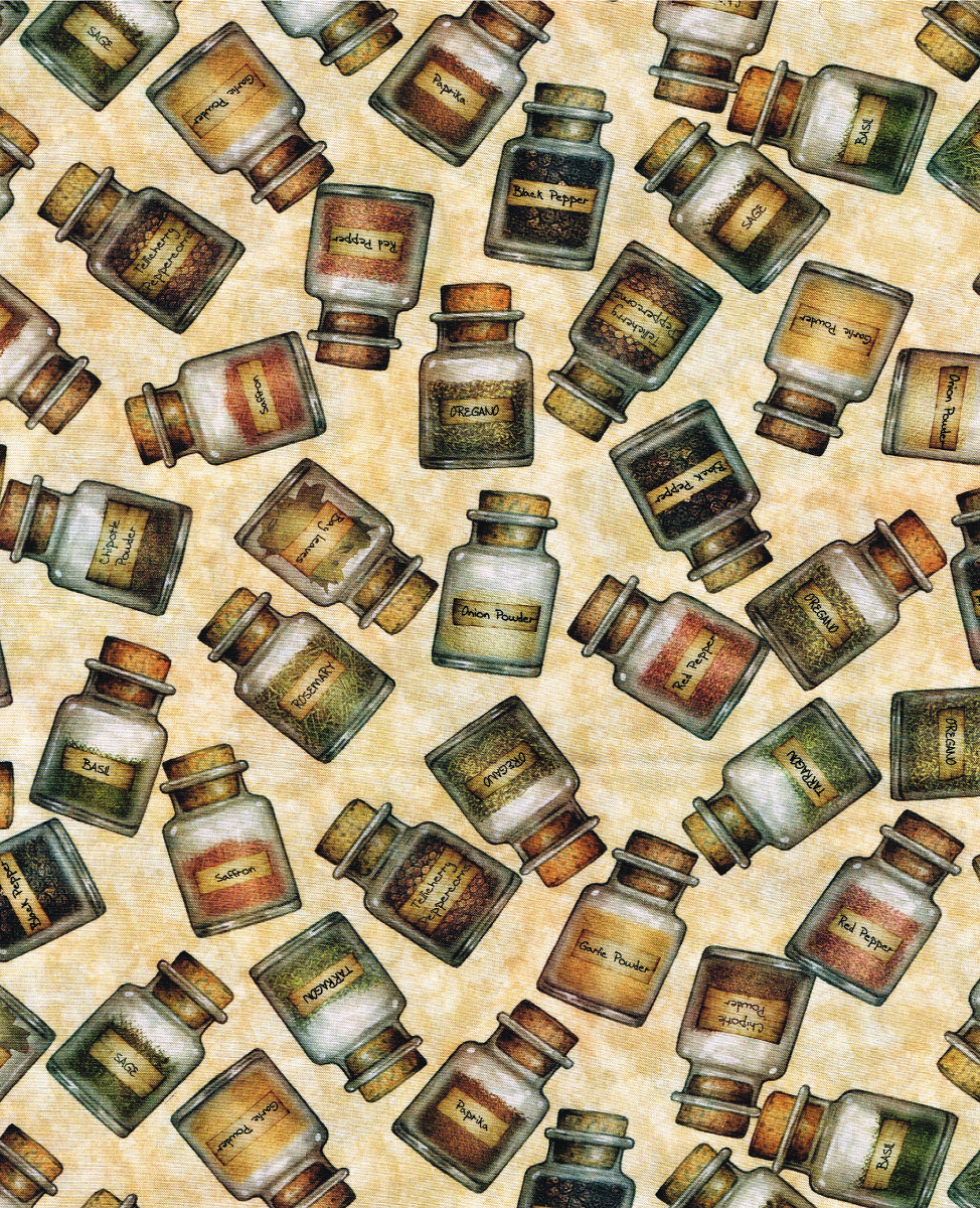 Description:Â 2600-30000-E – Sizzle & Spice – Spice Bottle Toss – 100% Cotton Fat Quarter